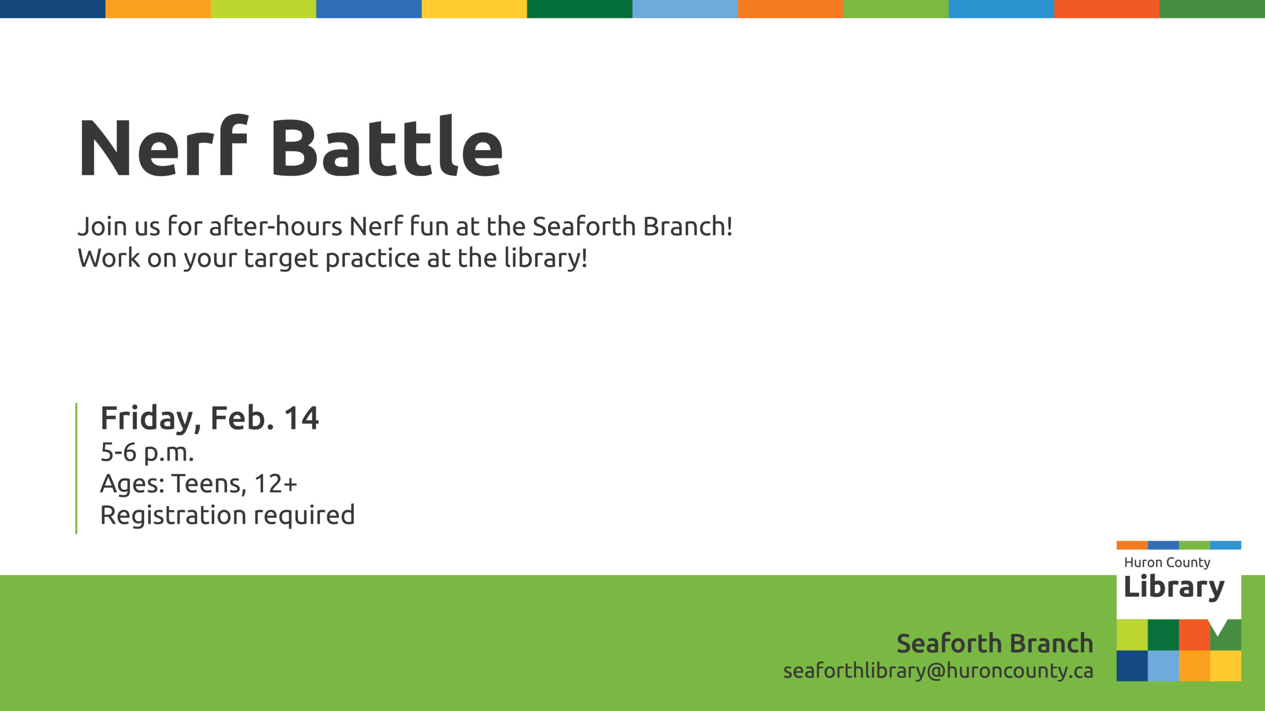 Join us for after-hours Nerf fun at the Seaforth Branch! Work on your target practice in the library.